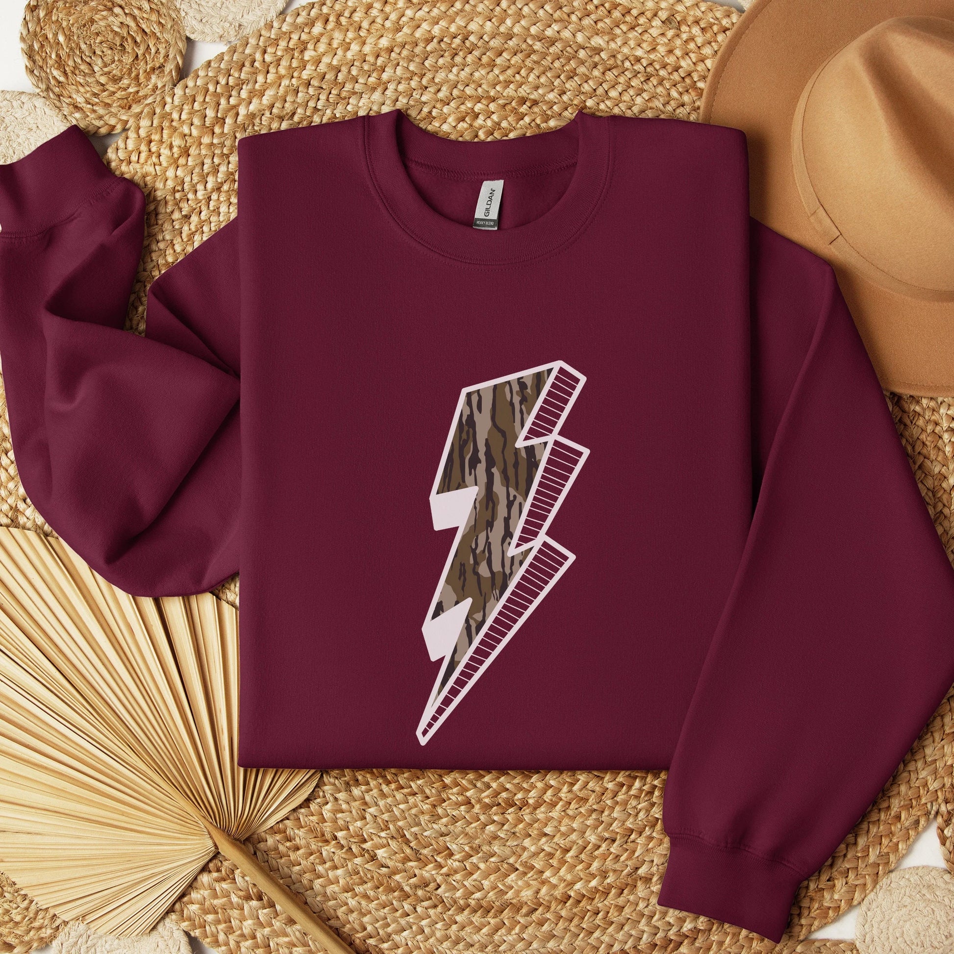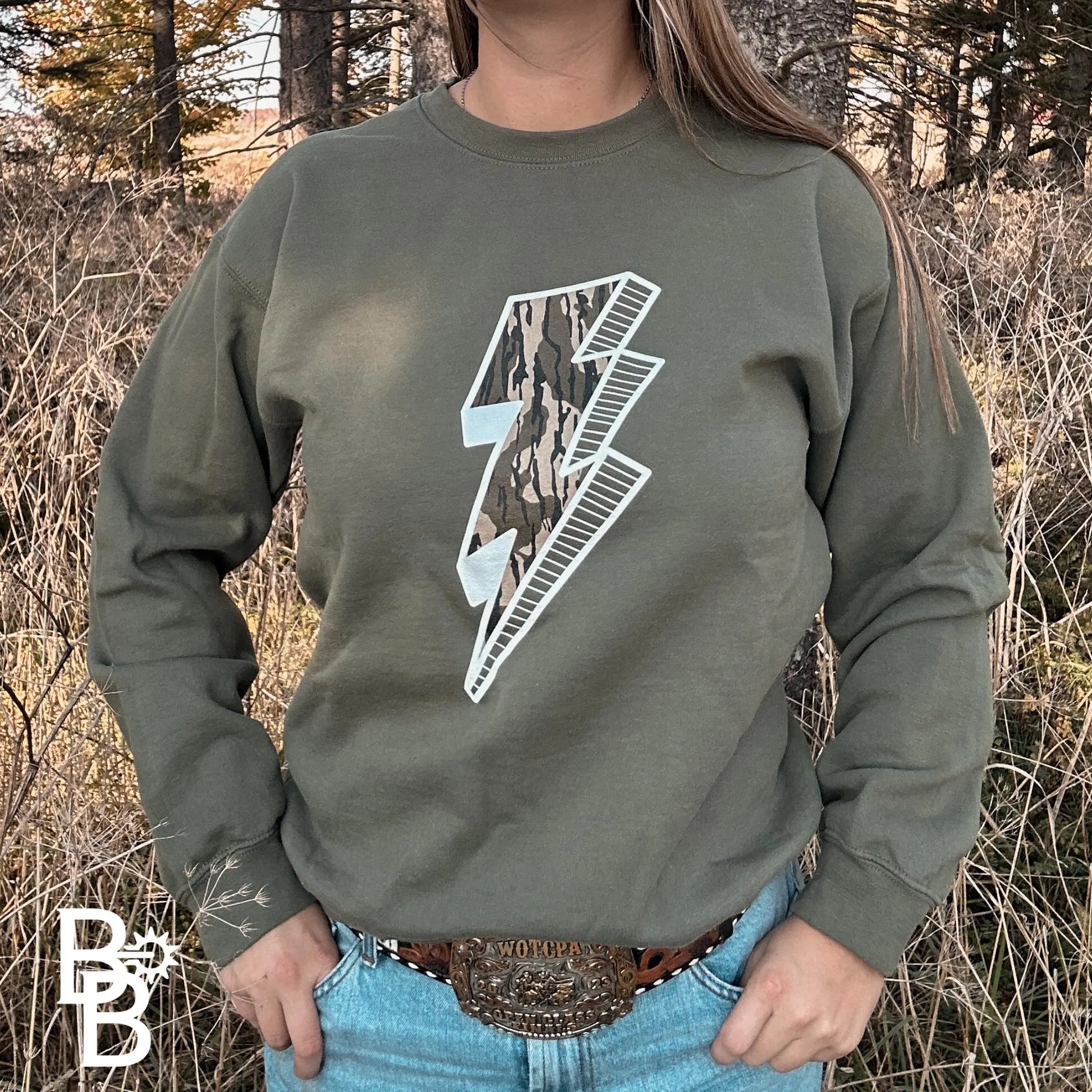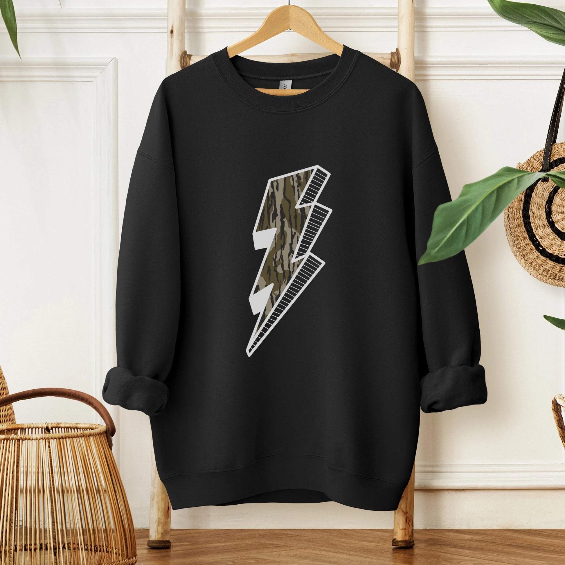 Charge into Style! Our Camo Lightning Bolt crewneck sweatshirt is the perfect blend of bold and casual. Featuring a striking camo lightning bolt outlined in crisp white, this design brings a touch of energy to your fall wardrobe.