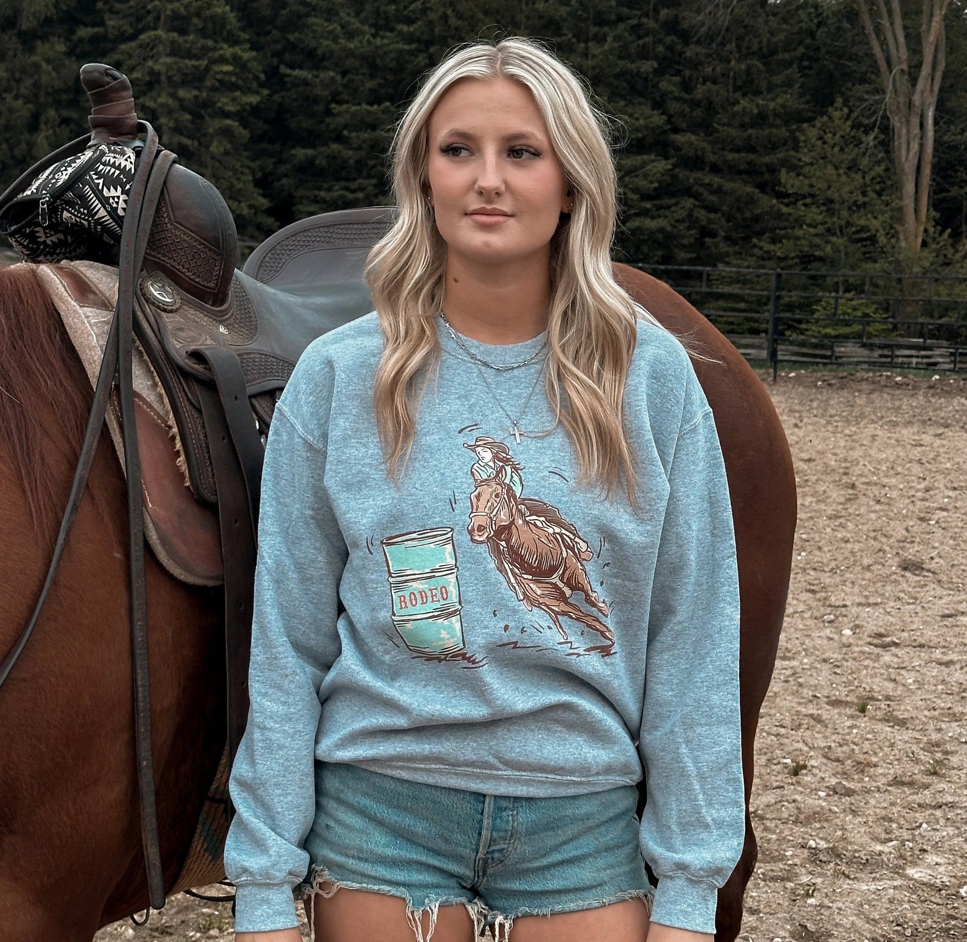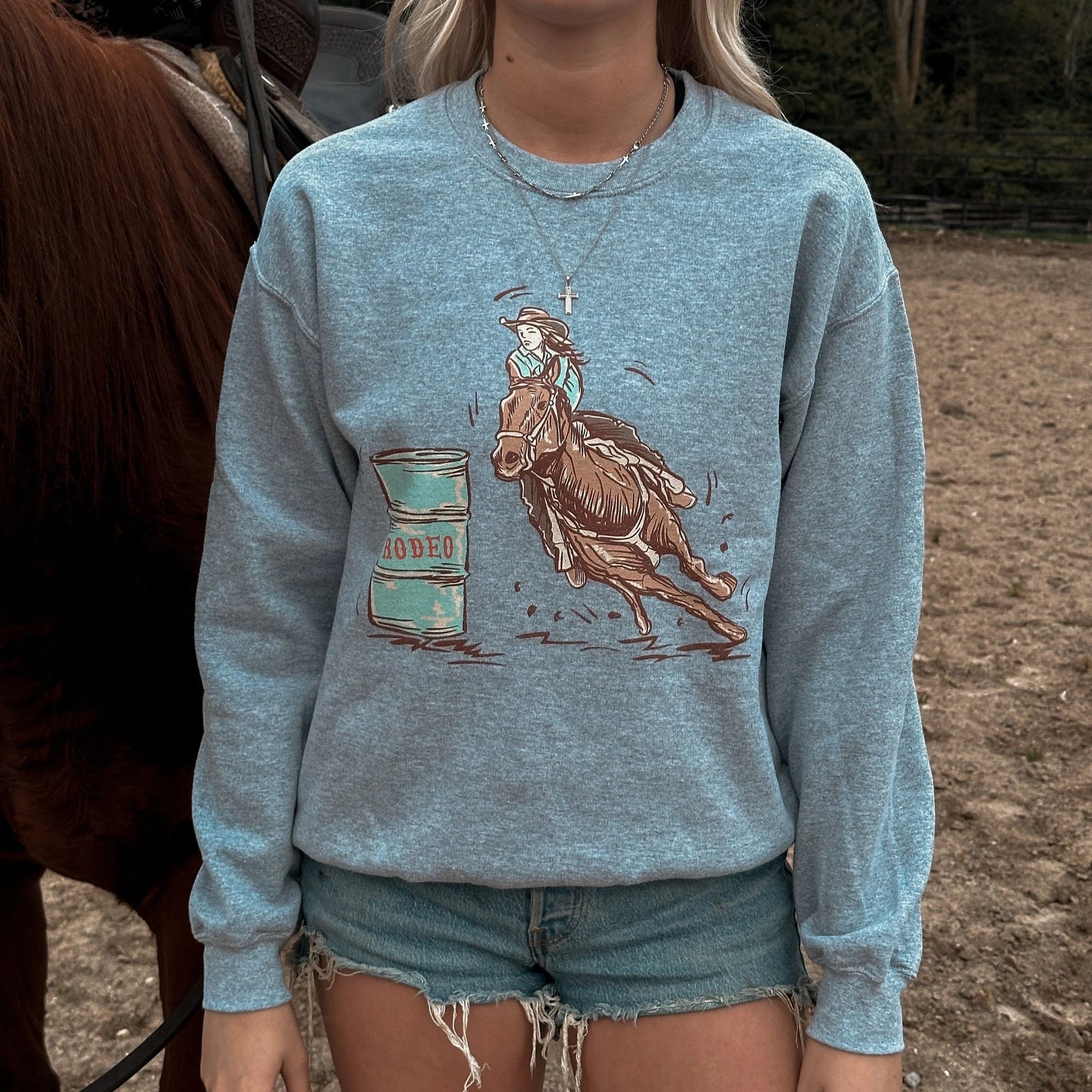 Designed for both comfort and style, this crewneck is ideal for layering on cool days or wearing as a standout piece on its own. Its classic fit and vintage design make it a great addition to any western wardrobe. Whether you're a barrel racing enthusiast or looking for a unique gift, this crewneck is sure to impress.