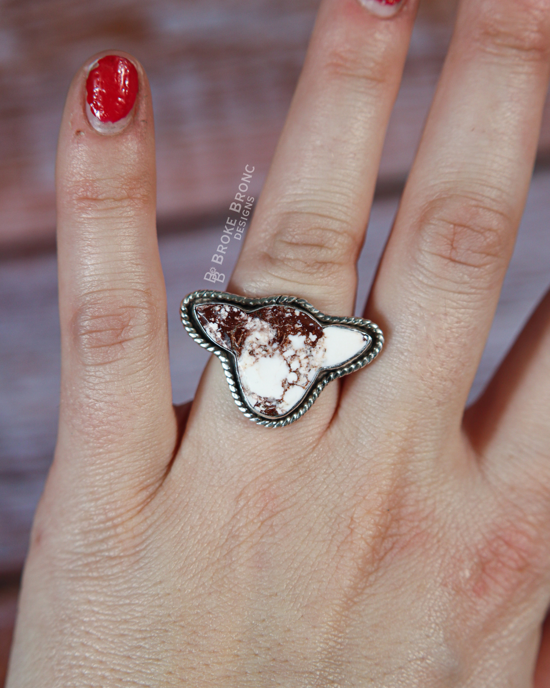This handcrafted sterling silver ring features a striking wild horse stone cut in the shape of a cow head, celebrating western heritage and timeless craftsmanship. The stone is securely set in a smooth flat bezel and framed with a twisted wire border, adding depth, texture, and classic silversmith detail. The bold yet refined design allows the unique character of the stone to take center stage.